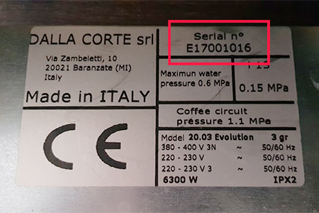 DALLA CORTE S/N 위치 : 드롭트레이 제거 후 확인가능